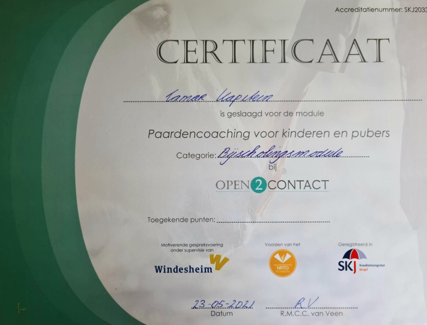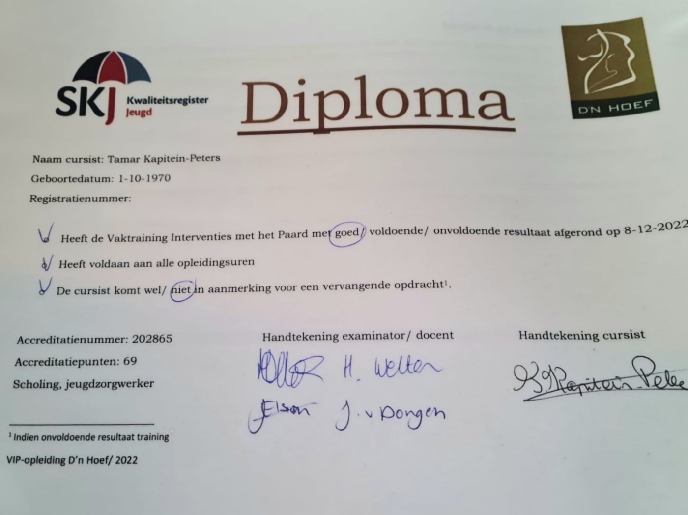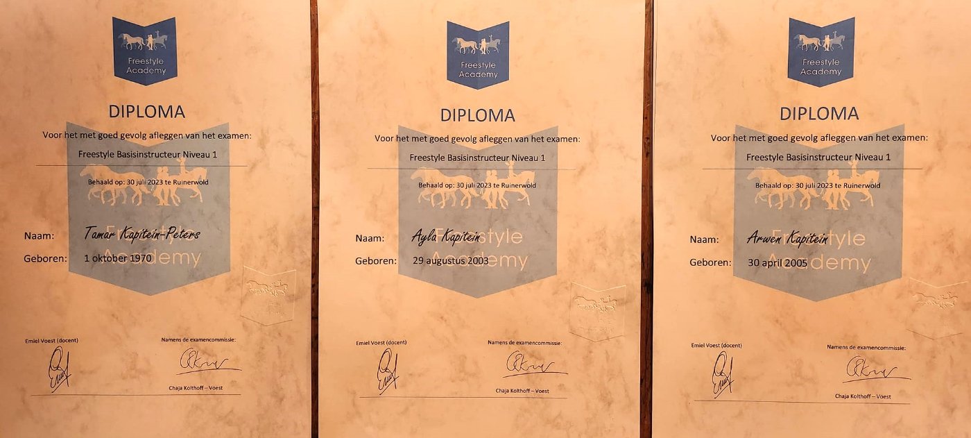 Tamar is sinds 2021 gediplomeerd Paardencoach middels de technieken van de Motiverende Gespreksvoering (MGV) en ze is daarnaast Pony power voor Kids- en Paardenkracht voor Pubers-trainer. Ook heeft Tamar de module Zorgkinderen gevolgd. In december 2022 heeft Tamar de Vaktraining Interventie Paard afgerond met een diploma. In juli 2023 hebben zowel Tamar als haar twee dochters Ayla en Arwen het diploma Freestyle Basisinstructeur niveau 1 behaald.