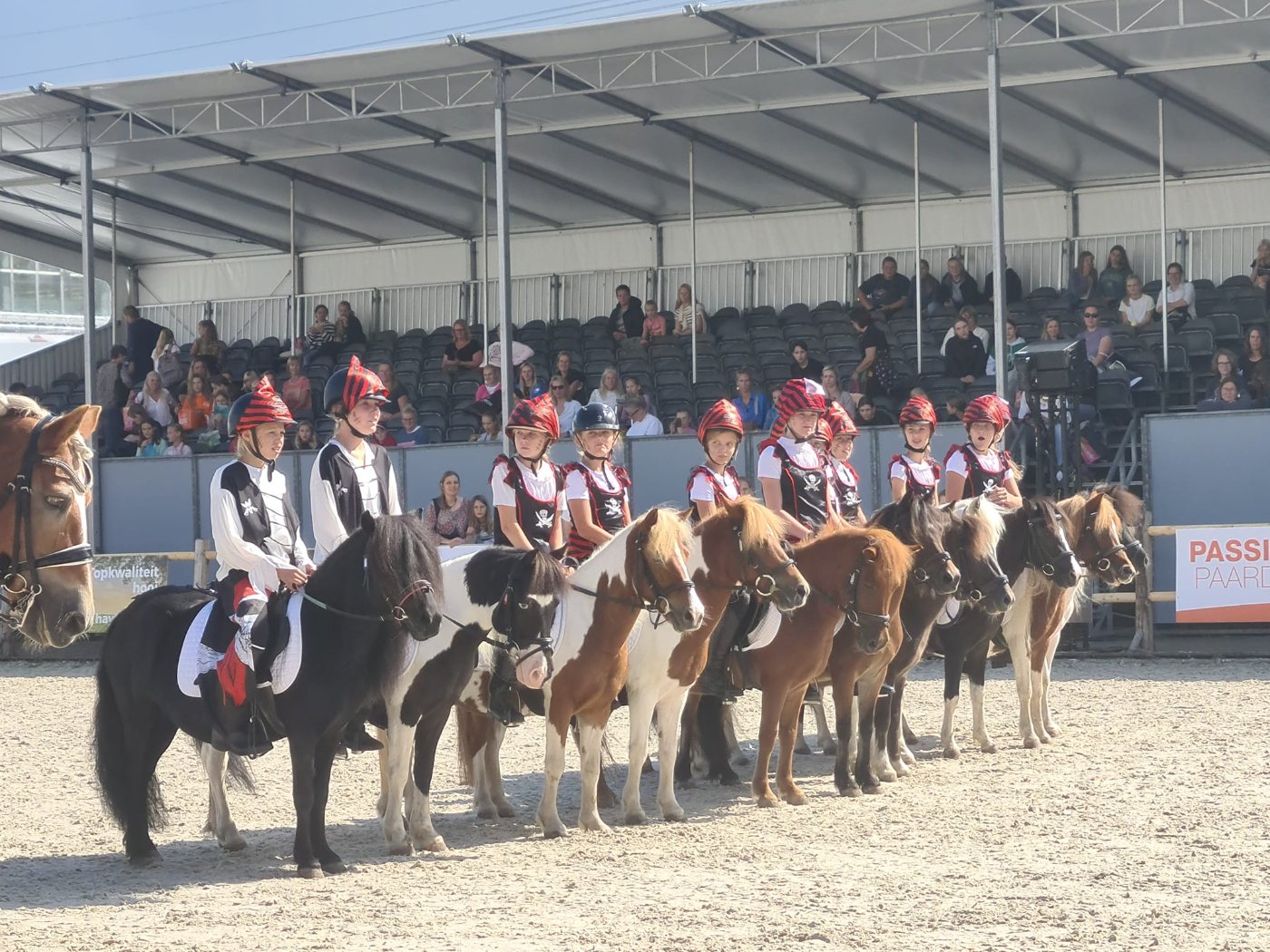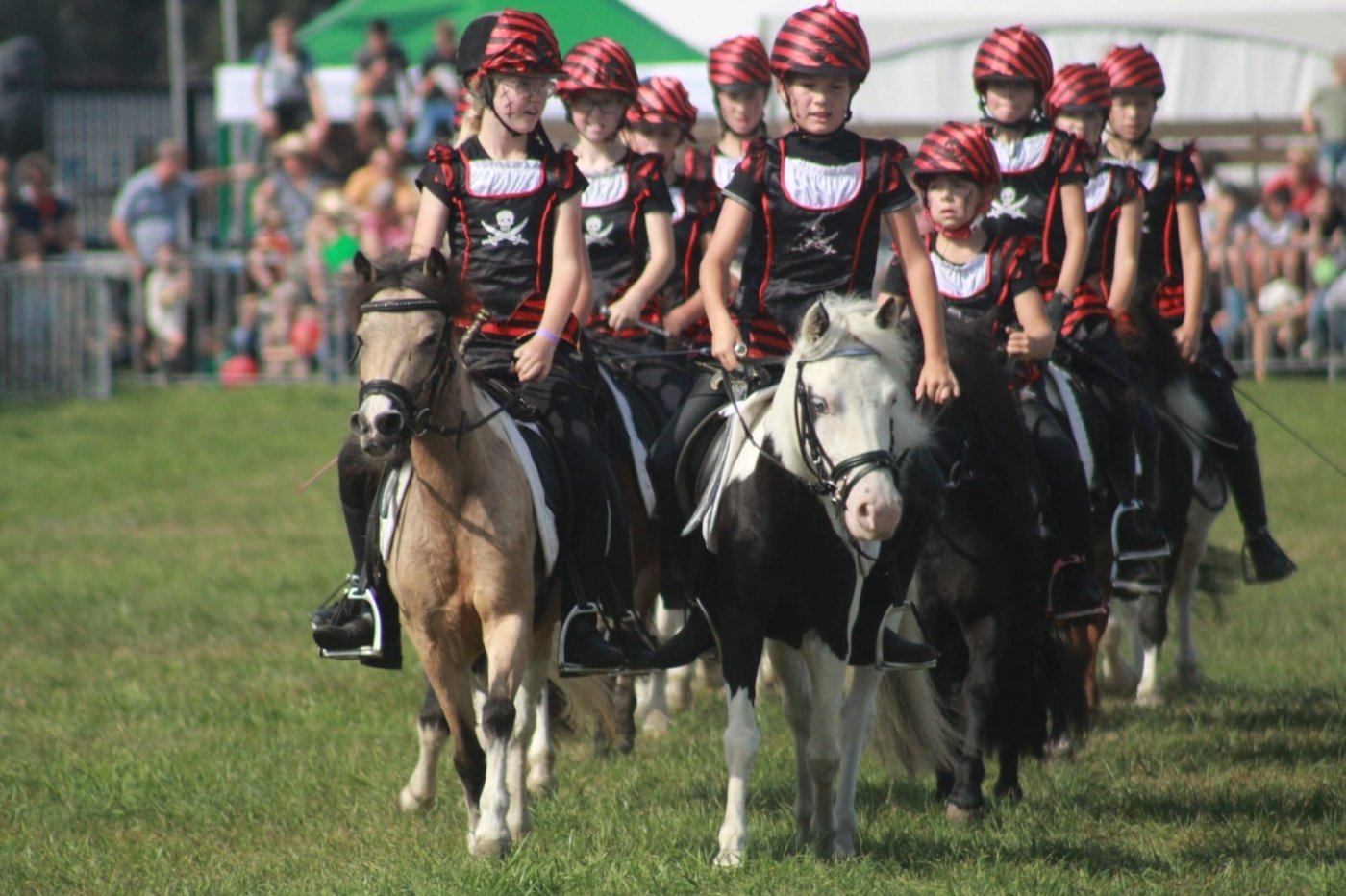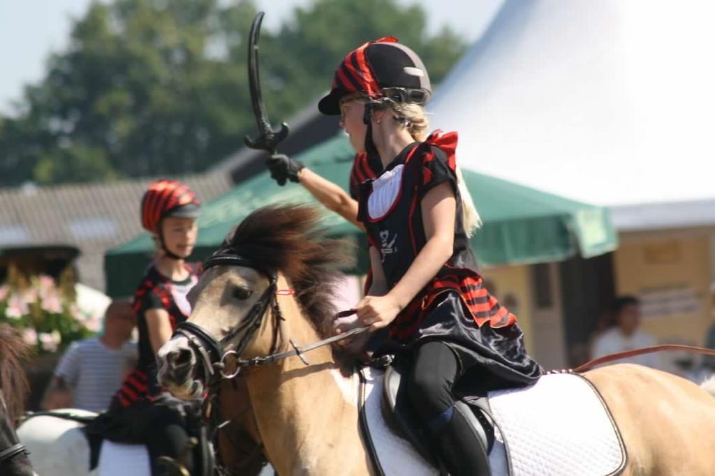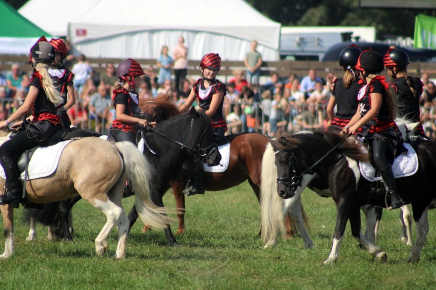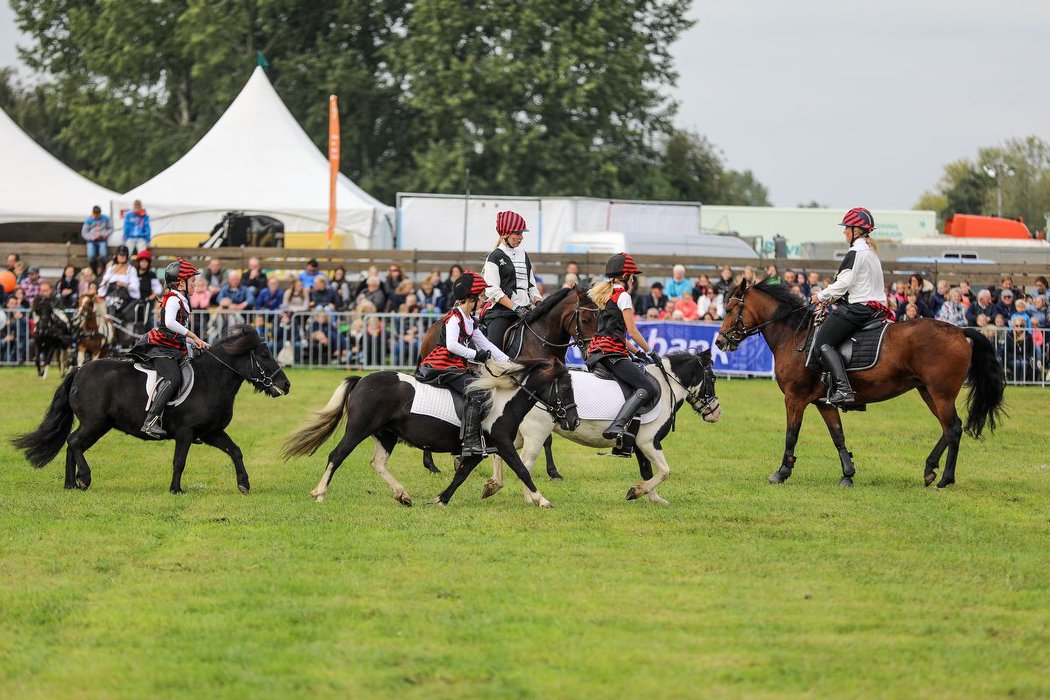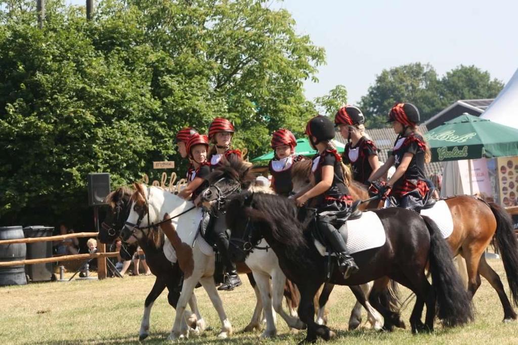 Ons showteam bestaat uit een groep enthousiaste amazones in de leeftijd van 6 tot 16 jaar oud. Zij rijden onder begeleiding van een instructrice een aantal keer per week onze pony’s. Al doende wordt er gewerkt aan de conditie van de pony’s en leert zowel kind als pony samen te werken. Onze dochters sturen hen ook aan bij de verzorging en indeling en regisseren de shows. Muziek, timing, samenwerken als team en vooral pret met de Sport-Shetten zijn zeer belangrijk bij het tot stand komen van de shows.
