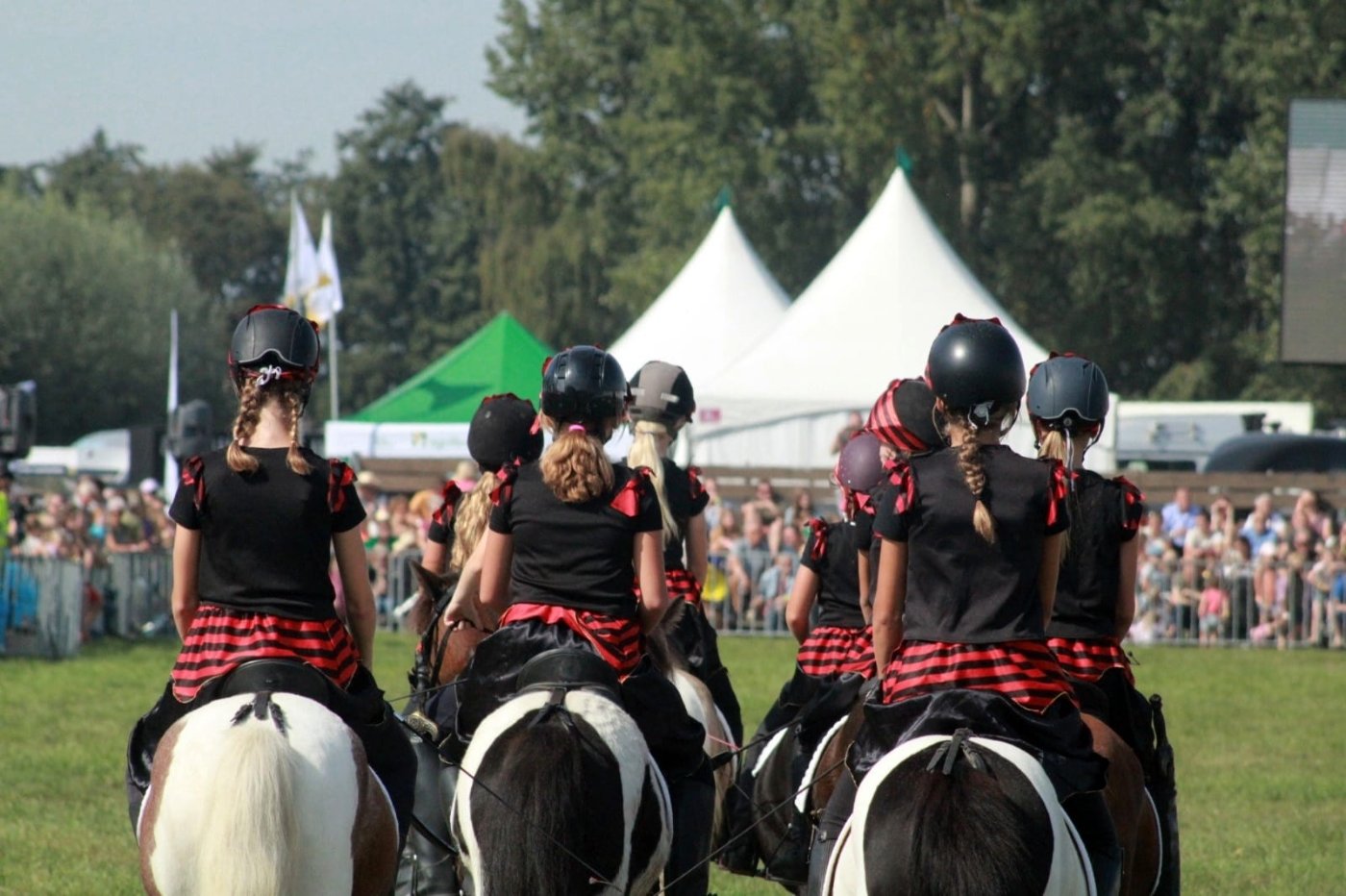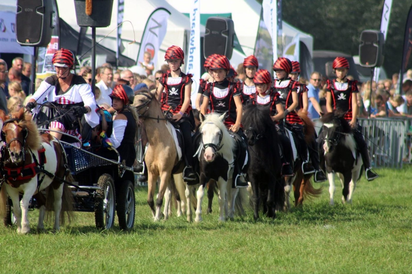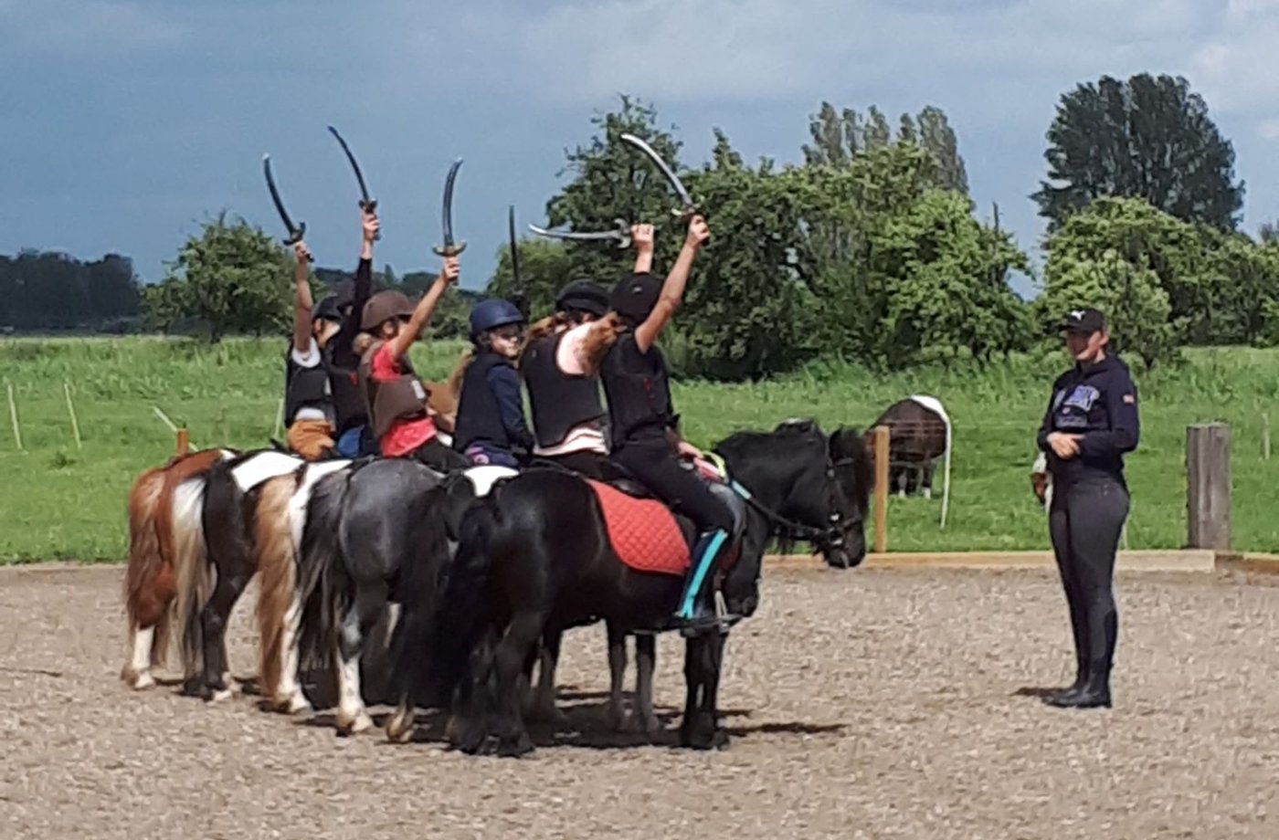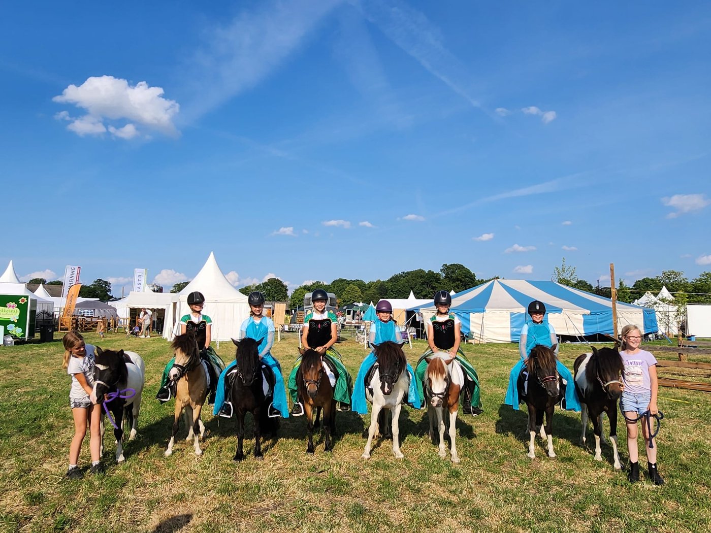 Ons showteam bestaat uit een groep enthousiaste amazones in de leeftijd van 6 tot 16 jaar oud. Zij rijden onder begeleiding van een instructrice een aantal keer per week onze pony’s. Al doende wordt er gewerkt aan de conditie van de pony’s en leert zowel kind als pony samen te werken. Onze dochters sturen hen ook aan bij de verzorging en indeling en regisseren de shows. Muziek, timing, samenwerken als team en vooral pret met de Sport-Shetten zijn zeer belangrijk bij het tot stand komen van de shows.