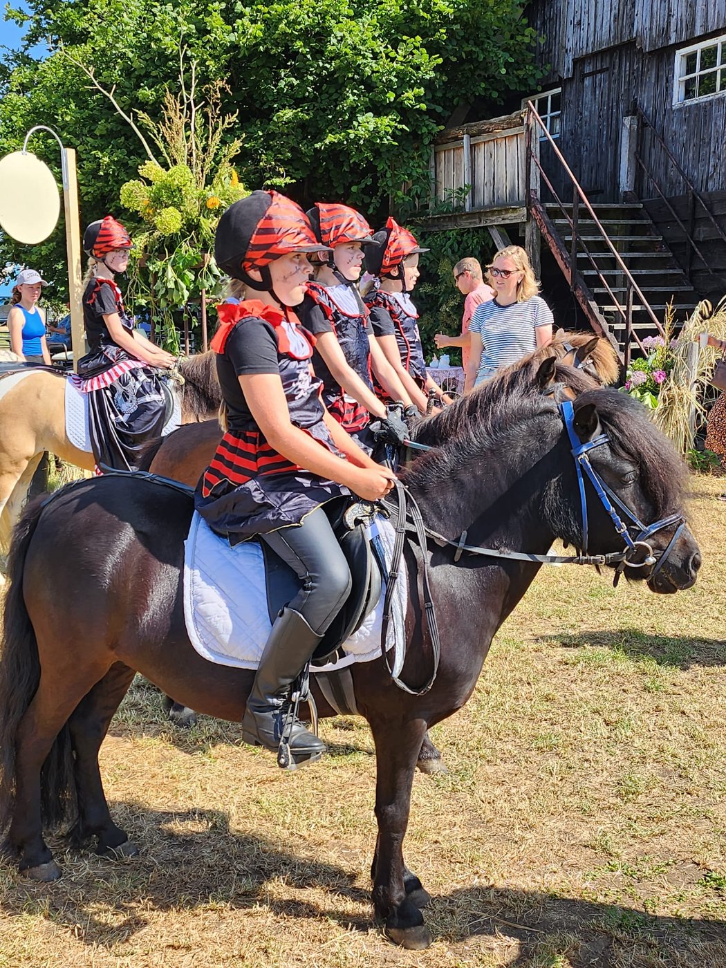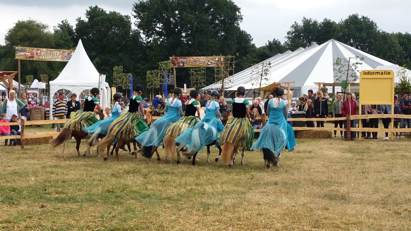 Het vinden van goede jonge amazones die zelfstandig pony’s kunnen op- en afzadelen en goed en met lef kunnen rijden, is niet makkelijk. Daarnaast moeten de ruiters ook sociaal zijn en in teamverband kunnen en willen werken. Tot nog toe hebben we ze kunnen selecteren uit de ruiters die bij ons hebben gereden voordat wij een zorgboerderij werden. Ook onze cliënten krijgen bij ons therapeutische paardrijlessen en we zijn er dan ook heel blij mee dat we nu ook ruiters van de dagbesteding in ons showteam hebben. Het is zo mooi om te zien hoe zij zoveel geleerd hebben op het gebied van zelfvertrouwen, motoriek en samenwerken en dat ze dit uiteindelijk kunnen presenteren voor publiek. Dit maakt dat wij een heel bijzonder en hecht showteam hebben, dat veel liefde voor elkaar en de pony’s naar buiten toe uitstraalt en waar menigeen van geniet.